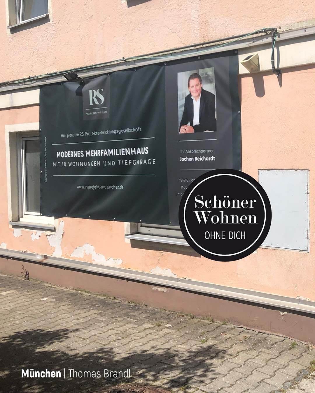 ein Banner verkündet die frohe Kunde: Hier entsteht ein „Modernes Einfamilienhaus mit 10 Wohnungen und Tiefgarage“ höchstwahrscheinlich 10 unbezahlbare Wohnungen und garantiert wieder einmal OHNE Dich.
